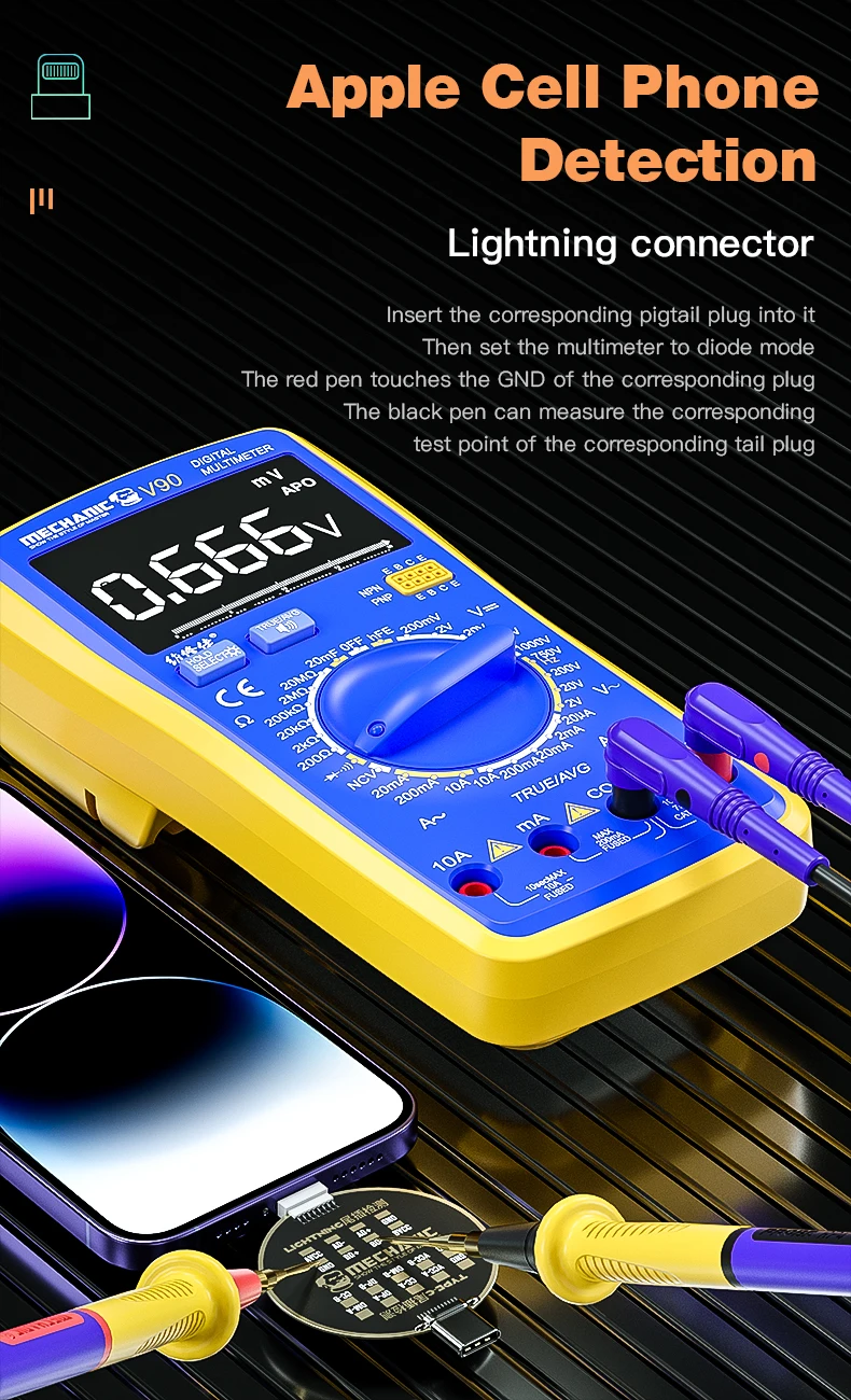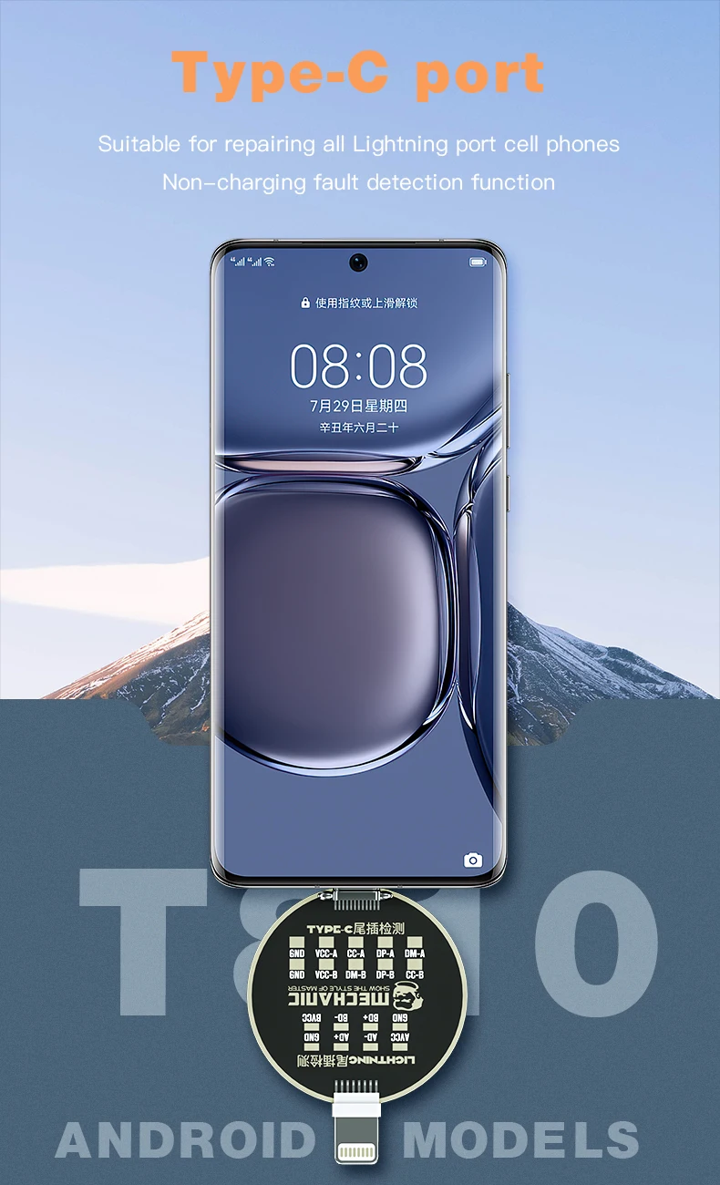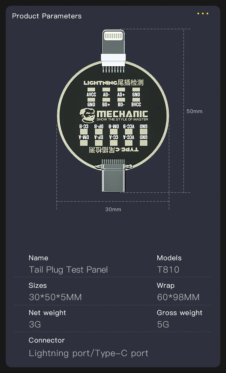 Dock test PIN de carga iPhone – android type-c – lightning detección de fallas sin carga MECHANIC T810