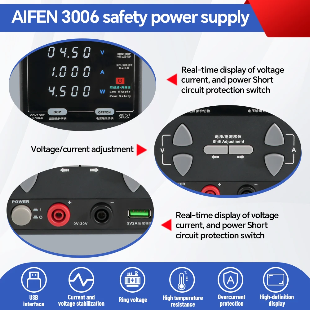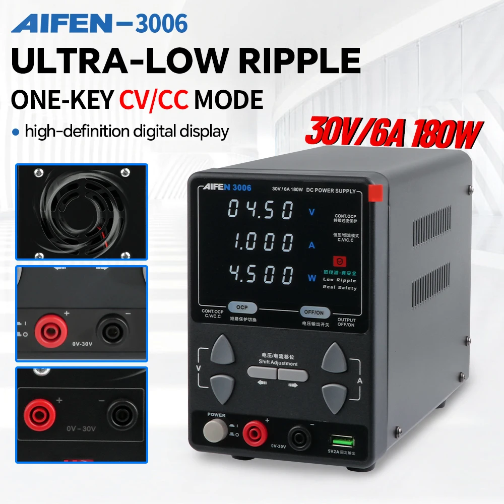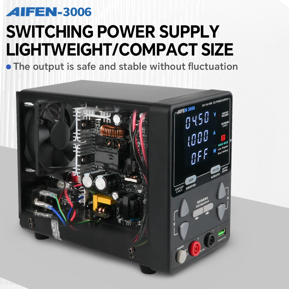 Para seguridad y durabilidad, cuenta con protecciones contra sobrecorriente, cortocircuito y sobretemperatura, y un sistema de ventilación automática que ayuda a mantener temperaturas de trabajo estables. Si buscas una fuente compacta, estable y confiable, la AIFEN 3006 30V 6A 180W es una excelente opción para elevar la calidad de tus pruebas y reparaciones.
