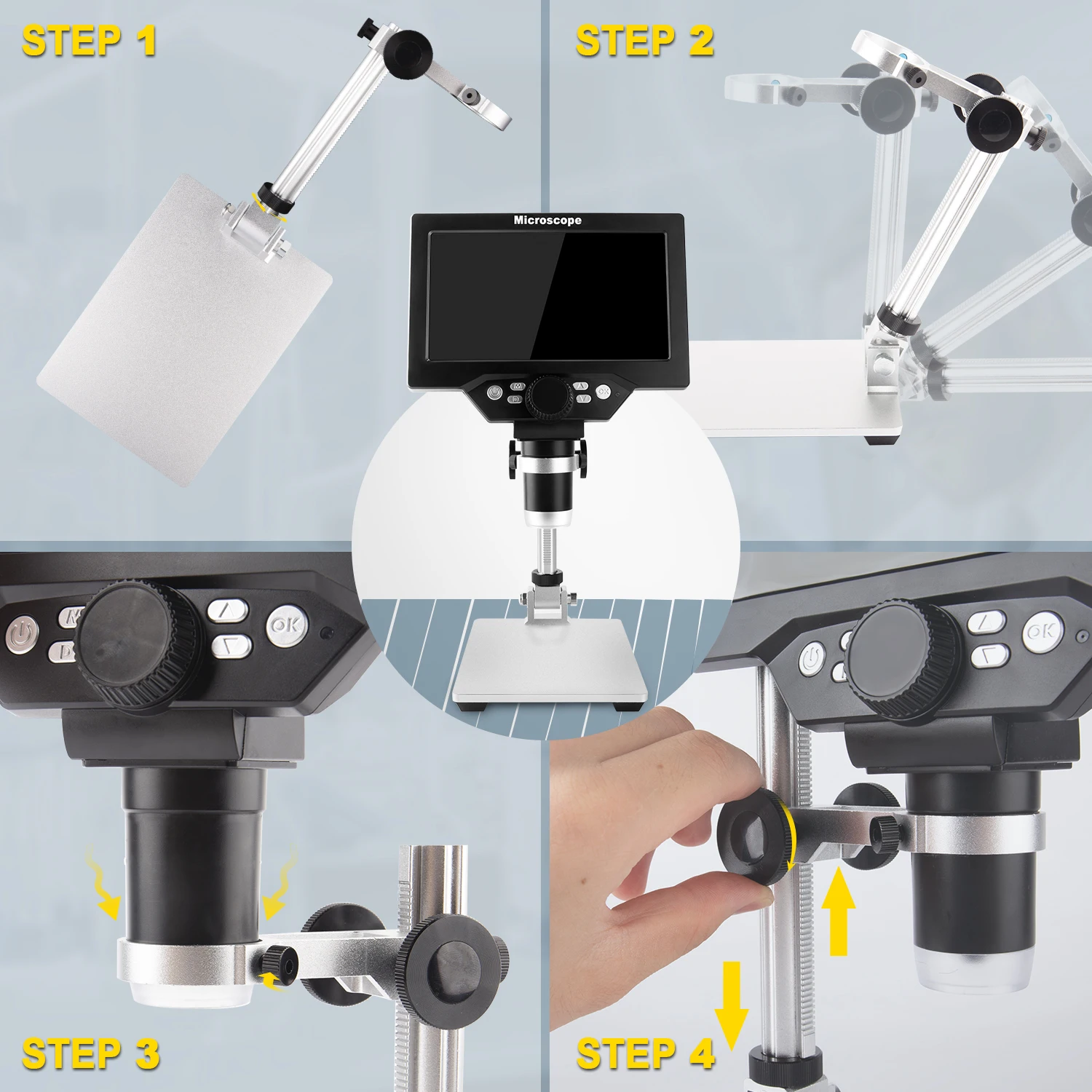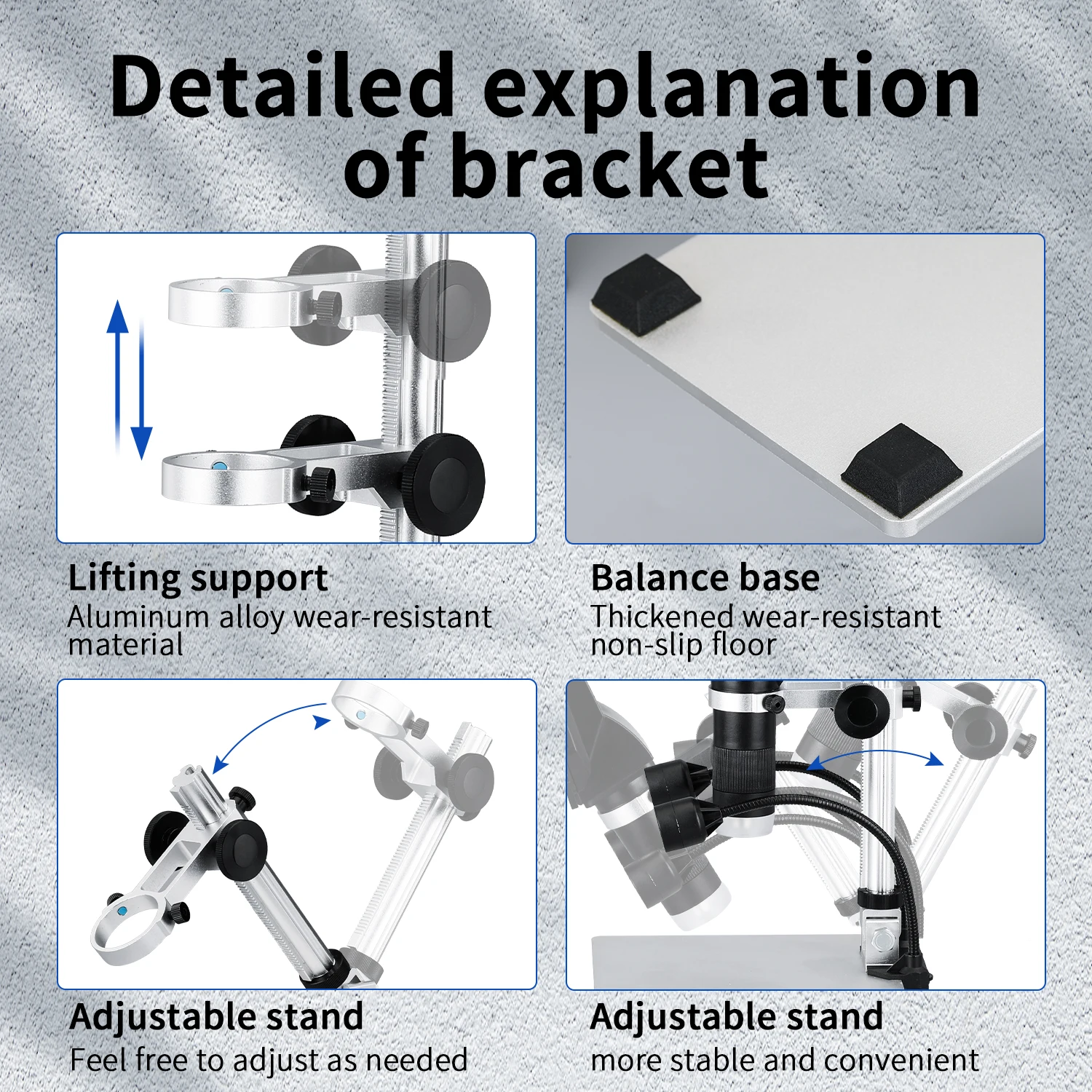 Las 2 lámparas LED laterales son totalmente ajustables y eliminan sombras en la zona de trabajo, algo clave cuando inspeccionas conectores, puertos o componentes muy pequeños. Además, el soporte metálico ofrece buena estabilidad y una altura regulable para adaptar el campo de visión a cada tarea.